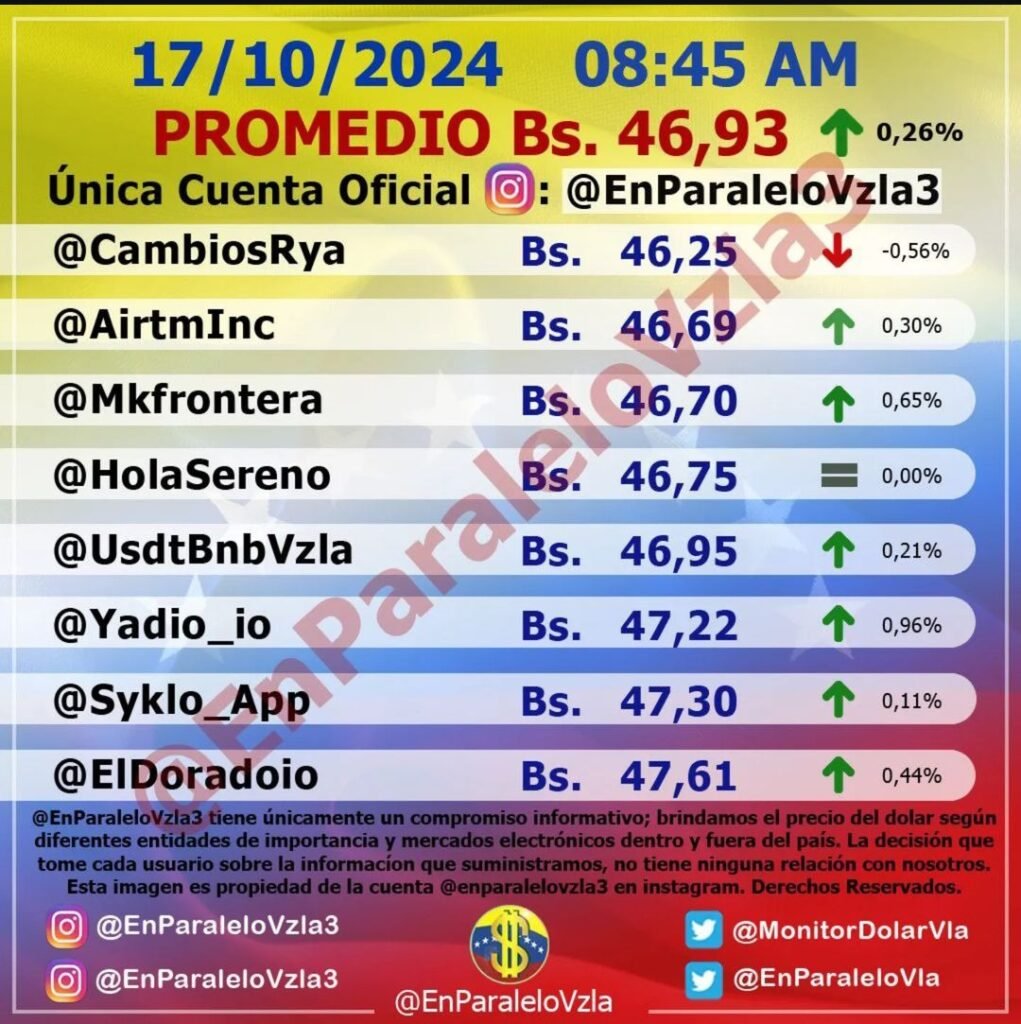 De acuerdo con la primera actualización del día, en horas de la mañana (08:45am), el monto del mercado informal de Venezuela, del portal DolarToday, se situó en 46,90 bolívares digitales. Por su parte, Monitor Dólar (@enparalelovzla3) cotizó la moneda estadounidense hoy jueves en 46,93 bs.