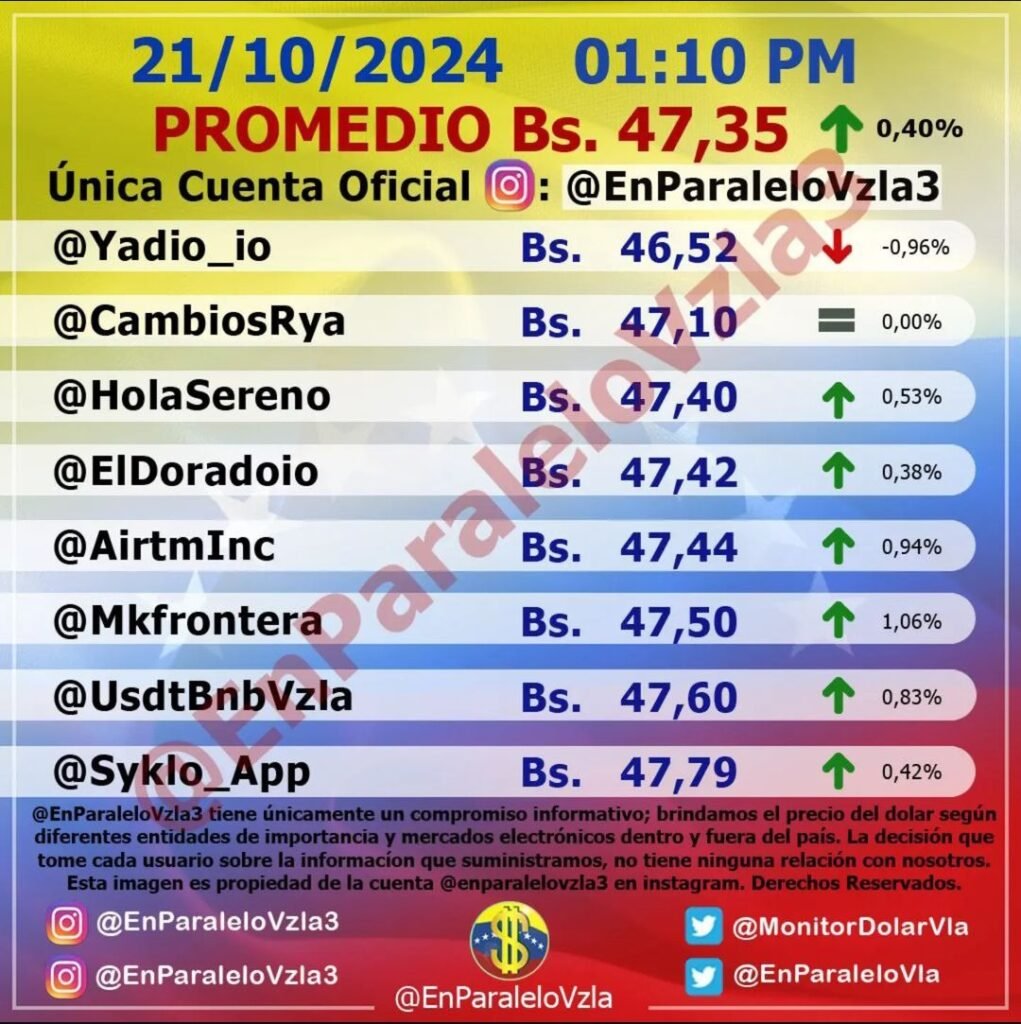 De acuerdo con la segunda actualización del día, en horas de la mañana (01:10pm), así cerró el monto del mercado informal de Venezuela, del portal DolarToday, se situó en 46,90 bolívares digitales. Por su parte, Monitor Dólar (@enparalelovzla3) cotizó la moneda estadounidense hoy lunes en 47,35 bs.