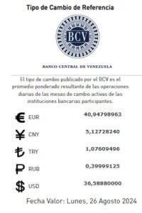 Para este lunes 26 de agosto el dólar, según el Banco Central de Venezuela estará en 36,58 bolívares y el euro es 40,94 bolívares.