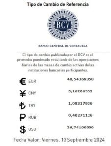 Este viernes 13 de septiembre del 2024, el dólar del Banco Central de Venezuela tendrá un precio de: 36,74 bolívares. Y el euro 40,54 bolívares.