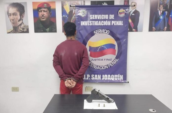 Funcionarios de la Policía Municipal de San Joaquín aprehendieron a un joven de 22 años de edad por el presunto porte ilícito de un arma de fuego, durante un procedimiento de seguridad que se realizó en el sector Manuelita Sáenz, en esta localidad del oriente del estado Carabobo.