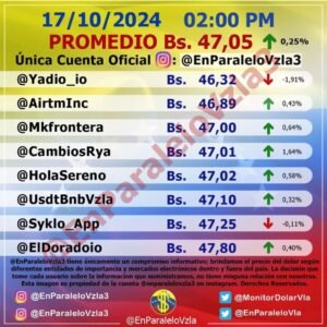 El dólar del Banco Central de Venezuela (BCV) se encuentra en 39,13 bolívares por cada dólar en su actualización del día, mientras el dólar paralelo según la cuenta Monitor Dólar @enparalelovzla3 para la 1:15 PM cotizó la divisa en 47,05 bolívares reflejando un alza de 0,25 por ciento.