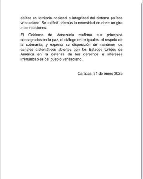 El Gobierno de Venezuela reafirmó sus principios consagrados en la paz, el diálogo entre iguales, el respeto de la soberanía, y expresa su disposición de mantener los canales diplomáticos abiertos con los Estados Unidos de América en la defensa de los derechos e intereses irrenunciables del pueblo venezolano.