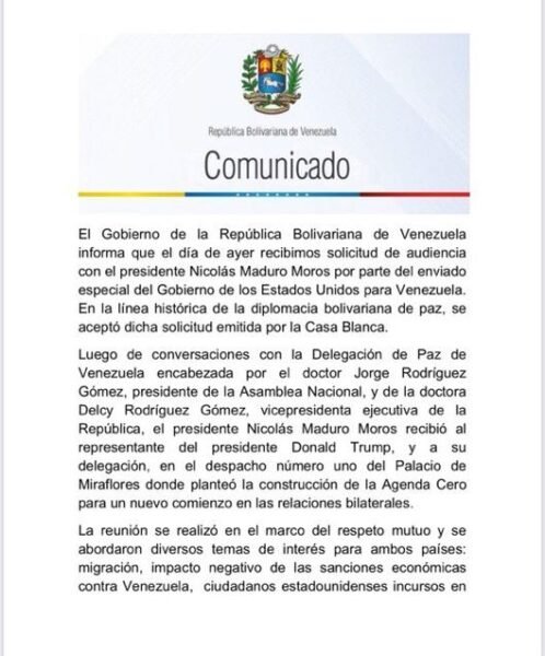 Luego de conversaciones con el presidente de Venezuela, Nicolás Maduro Moros, quien recibió al representante del mandatario Donald Trump, y a su delegación, en el despacho número uno del Palacio de Miraflores donde planteó la construcción de la «Agenda Cero» para un nuevo comienzo en las relaciones bilaterales.