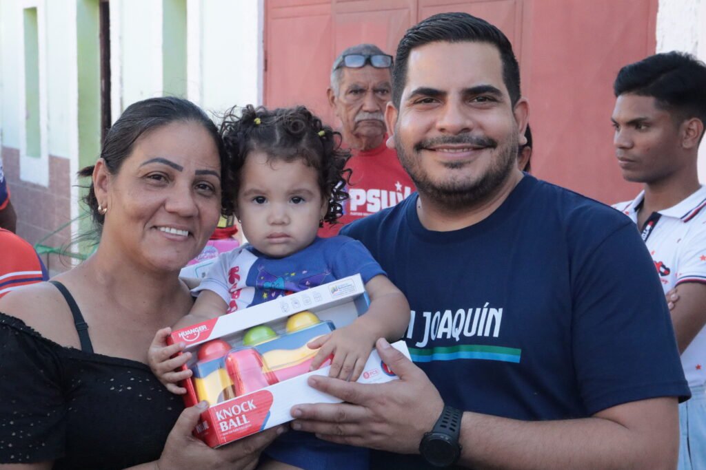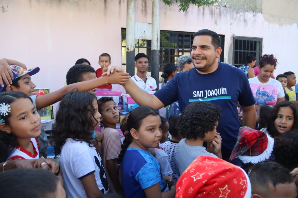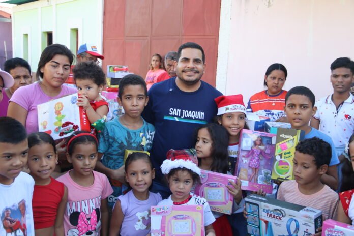 En el marco del despliegue social por las festividades decembrinas, el alcalde del municipio San Joaquín, Diego Corrales, encabezó una jornada de entrega de regalos que benefició a más de 150 niños y niñas del sector 19 de Abril, perteneciente a la Comuna Oro del Pueblo, en la zona norte de la localidad.
