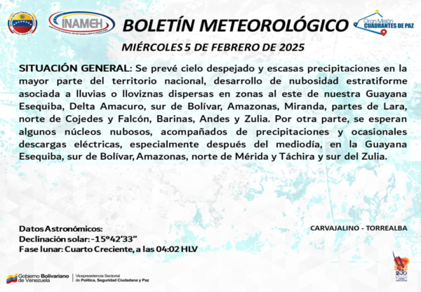 El Instituto Nacional de Meteorología e Hidrología (Inameh) informó que para este miércoles 5 de febrero de 2025, prevalecerá cielo despejado y escasas precipitaciones en gran parte de Venezuela.