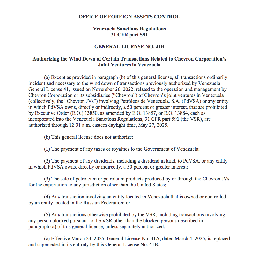 Este lunes, el Departamento del Tesoro de Estados Unidos, a través de la Oficina de Control de Activos Extranjeros (OFAC), emitió la licencia 41B que otorga una extensión en el plazo (27 de mayo) para que Chevron Corporation lleve a cabo una salida ordenada de sus operaciones en Venezuela.
