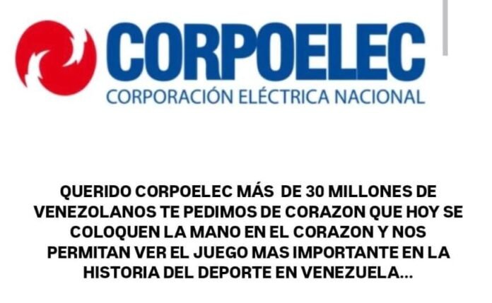 En medio de la euforia por el pase de Venezuela a la final del Clásico Mundial de Béisbol, los usuarios han inundado las redes sociales con peticiones para garantizar el servicio eléctrico durante el trascendental encuentro. Una de las publicaciones que más ha resonado entre la fanaticada muestra una imagen con el logotipo de la estatal eléctrica y un mensaje contundente: