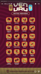 En la cuenta en Instagram de la FVF se publicó en las historias destacadas una lista de objetos prohibidos donde, además de restricciones justificadas a láseres, animales o armas de fuego, también se limitó el uso de banderas.