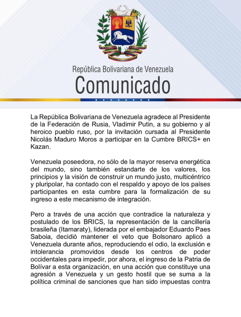 Pero -prosigue el texto-, «a través de una acción que contradice la naturaleza y postulados de los Brics, la representación de la Cancillería brasileña decidió mantener el veto que (el expresidente de Brasil Jair) Bolsonaro (2019-2022) aplicó a Venezuela durante años».