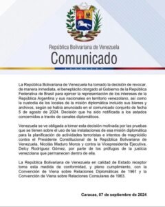 El gobierno venezolano ha tomado la decisión de revocar, de manera inmediata, el beneplácito otorgado a Brasil para ejercer la representación de los intereses de Argentina y sus nacionales en el país así como la custodia de los locales de la misión diplomática incluido sus bienes y archivos, según se había anunciado en el comunicado conjunto de fecha 5 de agosto de 2024.